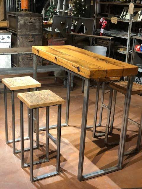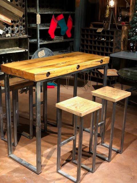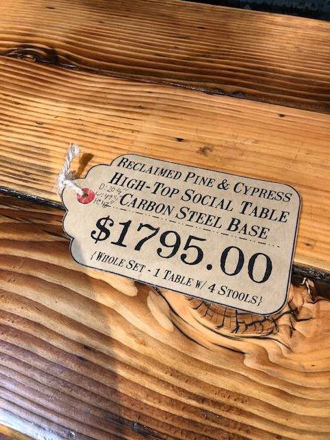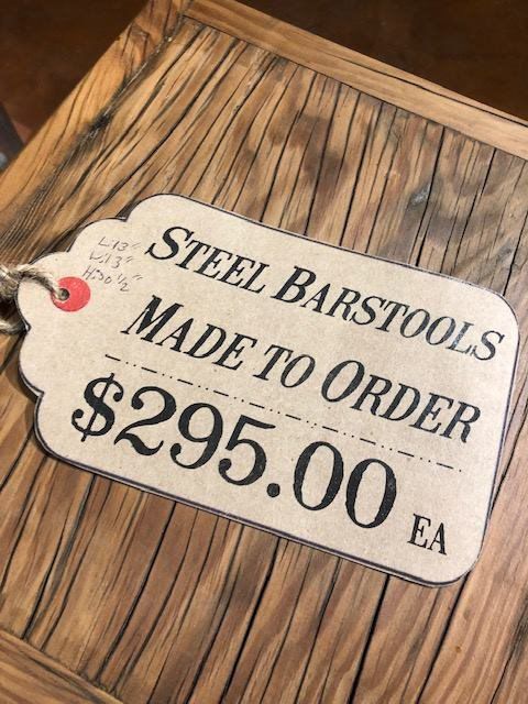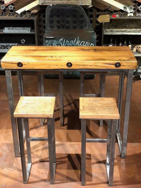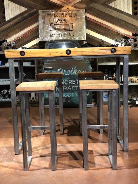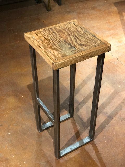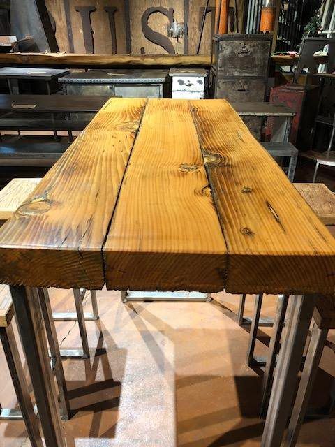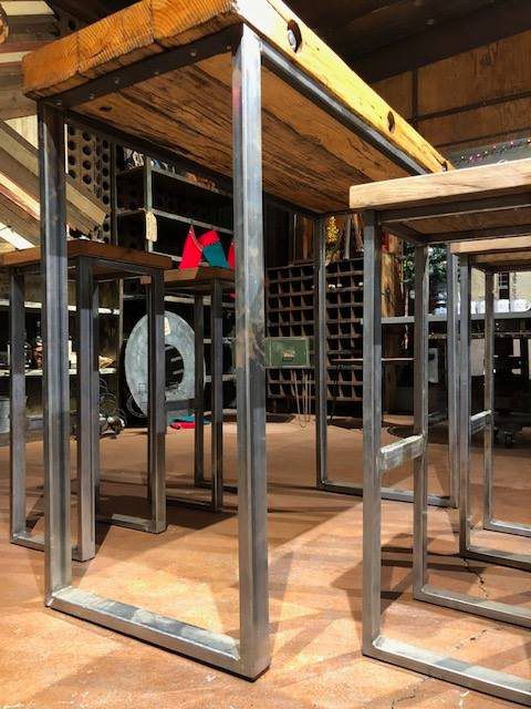 Carbon steel frames. 3"x7" Cypress slab tops.